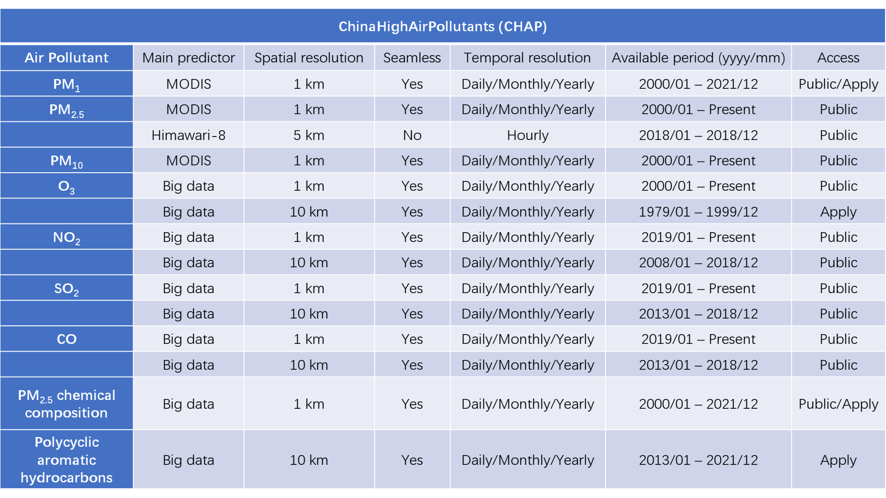 The ChinaHighAirPollutants (CHAP) dataset refers to the long-term [historical (HIS) and near real-time (NRT)], full-coverage, high-resolution, and high-quality datasets of ground-level air pollutants for China. It is generated from big data (e.g., ground-based measurements, satellite remote sensing products, atmospheric reanalysis, and model simulations) using artificial intelligence to account for the spatiotemporal heterogeneity of air pollution. The CHAP dataset includes 7 major air pollutants (i.e., PM1, PM2.5, PM10, O3, NO2, SO2, and CO), as well as PM2.5 chemical composition (i.e., SO42-, NO3-, NH4+, Cl-, BC, and OM), and ambient polycyclic aromatic hydrocarbons (PAHs), including 7 carcinogenic PAHs (i.e., BaA, Chr, BbF, BkF, BaP, DahA, IcdP). This CHAP dataset is public and freely available to all users!